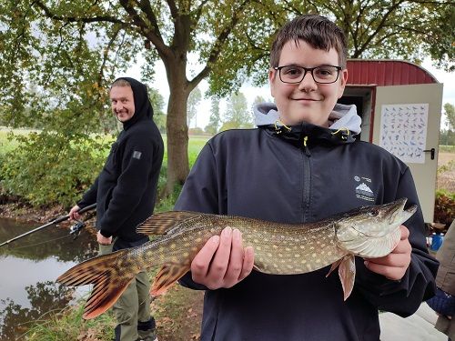Sogar einen schönen Hecht konnten wir im Teich Vinnenberg, dem Hausgewässer der Angelschule, fangen. Spätestens da waren Wind und Regen vollkommen egal!