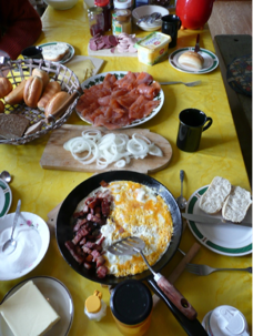 Gebeizte Meerforelle / Graved Lachs, Eier & Speck, Baguette – so sieht ein ganz annehmbares Fjordangler-Frühstück aus!
