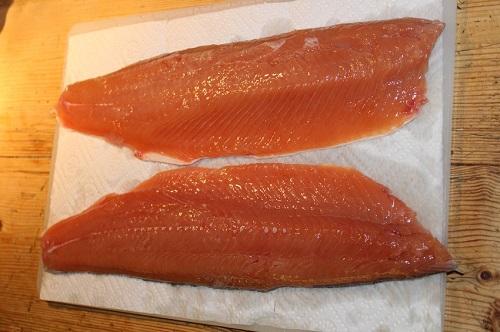 ...die wir gleich filetierten. Aber nicht nur, um das echte, sanft-rote Filet zu bewundern sondern auch, um daraus "Graved - Meerforelle" zu machen. Ein Genuss!