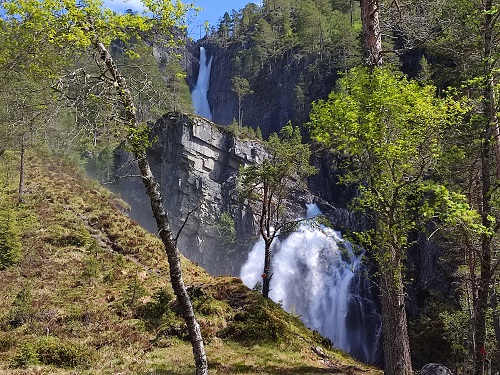 Wir angeln uns durch den Tag, genießen die Sonne über dem Fjord, schauen uns in der Gegend um und fahren nach Karvatn, stehen staunend vor den großen Wasserfällen, beobachten Forellen im glasklaren Wasser. Essen gut (vor allem natürlich frischen Fjordfisch), Leben gut - auch deswegen ist die Stimmung hervorragend.