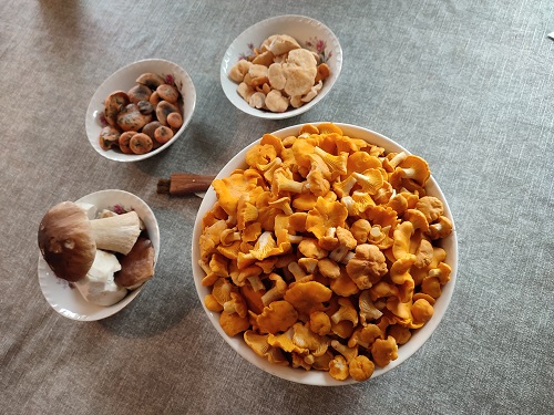 Pilze in rauen Mengen, über ein Dutzend verschiedener Arten. Hier Steinpilz, Pfifferling, Semmelstoppelpilz und Fichtenreizker. Ein kulinarischer Hochgenuß... Und: Ich habe viel gelernt!