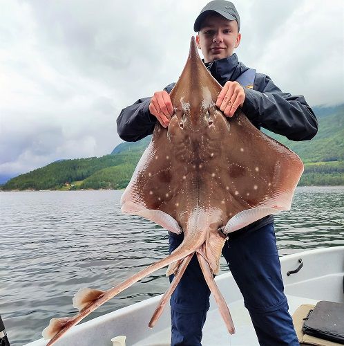 Das Einleitungsbild zu diesem Blog - Beitrag zeigt den 117cm - Spitzrochen von Finn - was ein Tiefsee-Urian! Spannender Drill vor der famosen Kulisse der "Schwarzen Wand" und nach diesem tollen Fisch am Abend dann gleich die erste Meter-Club-Ehrung dieser Tour..!