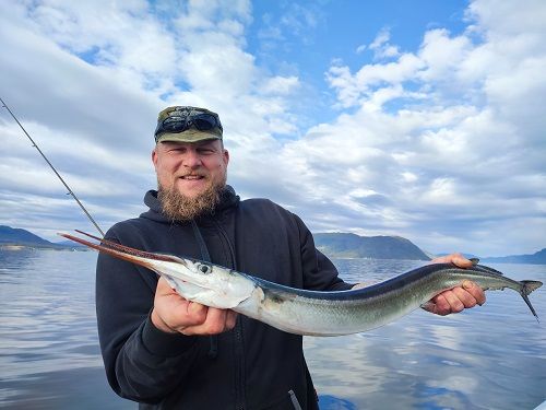 Das Eingangsbild zeigt den eigentlich spektakulärsten Fang: Ein dicker, fetter, langer Hornhecht. 97cm und 1345 gr. Fänger Daniel ist selber ein, ich will mal sagen, großer, kräftiger Typ und jeden Fisch den er in die Kamera hält muss man auch in diesem Kontext berücksichtigen. Vielleicht einer der Größten (Längsten) jemals in Nordeuropa gefangenen Hornhechte?